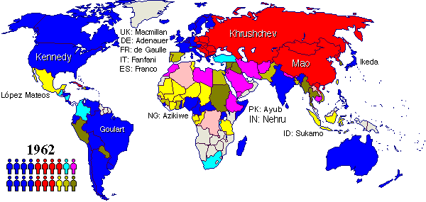 In domestic politics (and therefore invisible on the map), the 1960s were dominated by the coming of age of the generation which had been born after the Second World War. Because the birth rate had soared in the late 1940's following a major plummet during the previous bad times, this was probably the largest and most cohesive single generation of the century. The world's biggest country saw the biggest manifestation as the Cultural Revolution shook China. Here the Communist leadership used the young, idealistic Red Guards to break the power of the entrenched bureacracy -- and then used the Army to break the Red Guards. In Czechoslovakia, an idealistic move towards a less repressive regime provoked a Soviet invasion. In the United States, the youth movement focused its energies opposing American involvement in the Vietnamese Civil War, while in France, student rebellion almost brought down the government.
