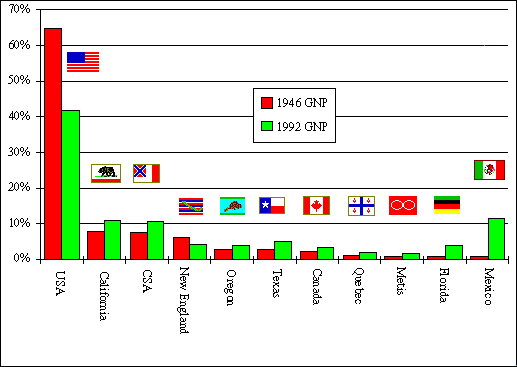 I suppose we could whittle off the edges of this nation -- no Louisiana Purchase states, no former slave states, an independent New York -- but even if we reduce the "USA" down to a six-star flag (IL, IN, MC, OH, PA, WS) it would still be the richest nation on the continent with 30% of the GNP in 1946 and 17% today.