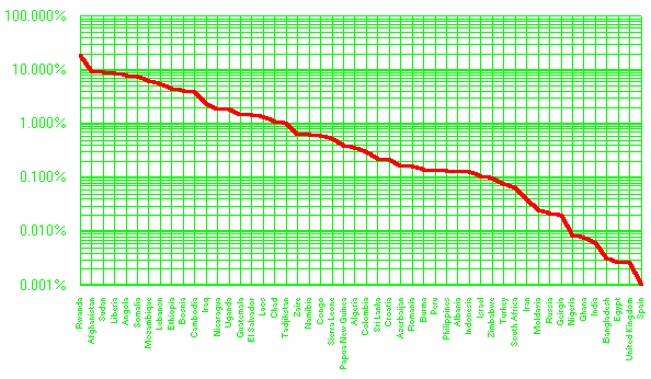 How many people would die in this rebellion? Well, I just happen to have on hand the death tolls from 50 civil wars fought during the period 1975-1999. Graphed as a percentage of the nation's total population, the death rates distribute like this: