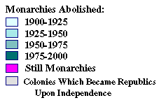 This is obviously a very subjective category. If it's a new country, then I usually just pick the year that sovereignty was established, but older countries are a problem. Since every usurper who earns his crown on the battlefield, in a coup, or in some back-room deal will claim untarnished legitimacy, we can, if we're feeling generous, track an unbroken chain of legitimacy back to the dawn of time for every monarchy on the planet. This is clearly not the case, so I have tried to find moments when the crown is passed to someone who is not the obvious hereditary candidate, or moments when the entire government is restructured.